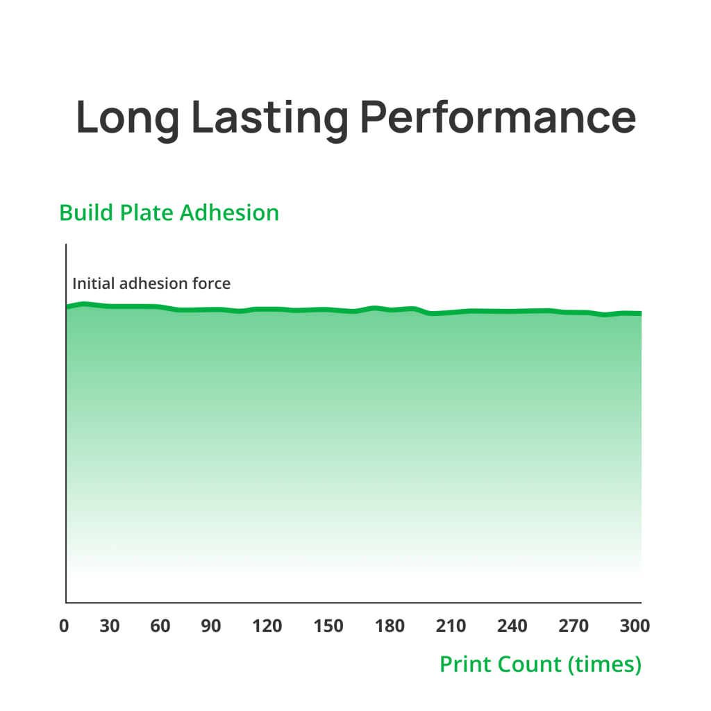 پوشش SuperTack مقاومت زیادی دارد و حتی پس از استفاده طولانی، خاصیت چسبندگی خود را حفظ میکند. این ویژگی باعث میشود عمر صفحه ساخت بیشتر شده، هزینههای چاپ کاهش یابد (کمتر از ۲۰٪ کاهش چسبندگی پس از ۳۰۰ چاپ) و در عین حال انتشار کربن کمتر شود.